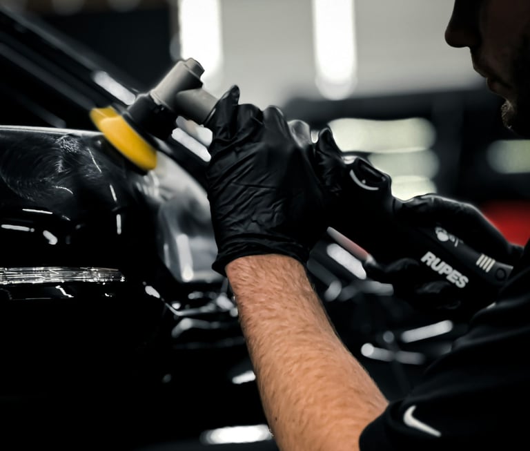 Met een grof polijstmiddel halen we diepere krassen uit de lak weg. Tot 80% van de diepere krassen en imperfecties kunnen we verwijderen.Tweede correctie stap