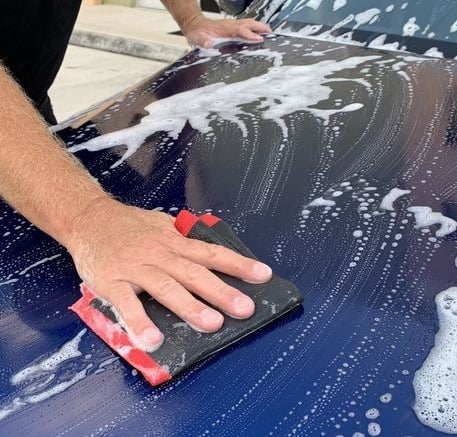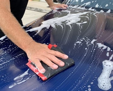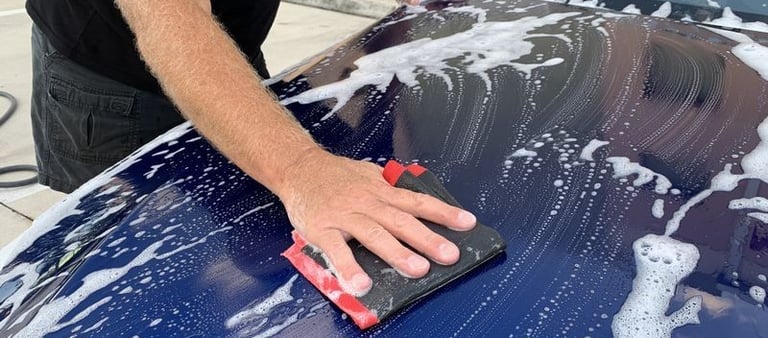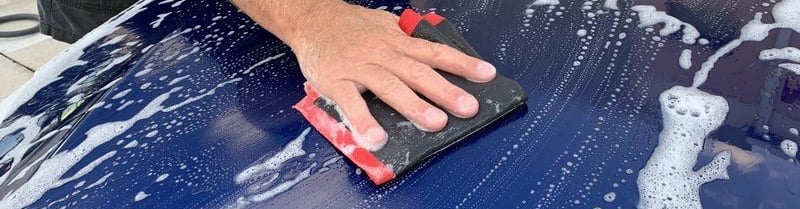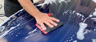 Wassen met een rinseless wash: We benevelen de wagen met een rinseless oplossing (P&S Absolute) en wassen hem grondig met een ultra safe sponge (speciaal voor rinseless wassen).